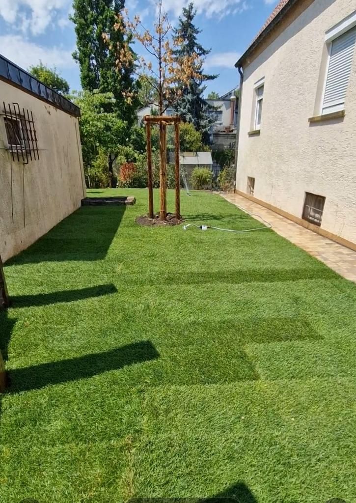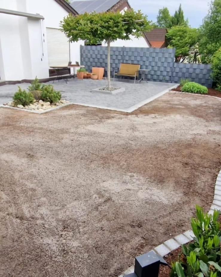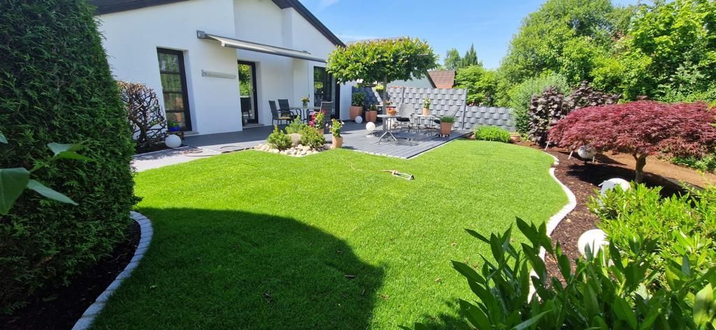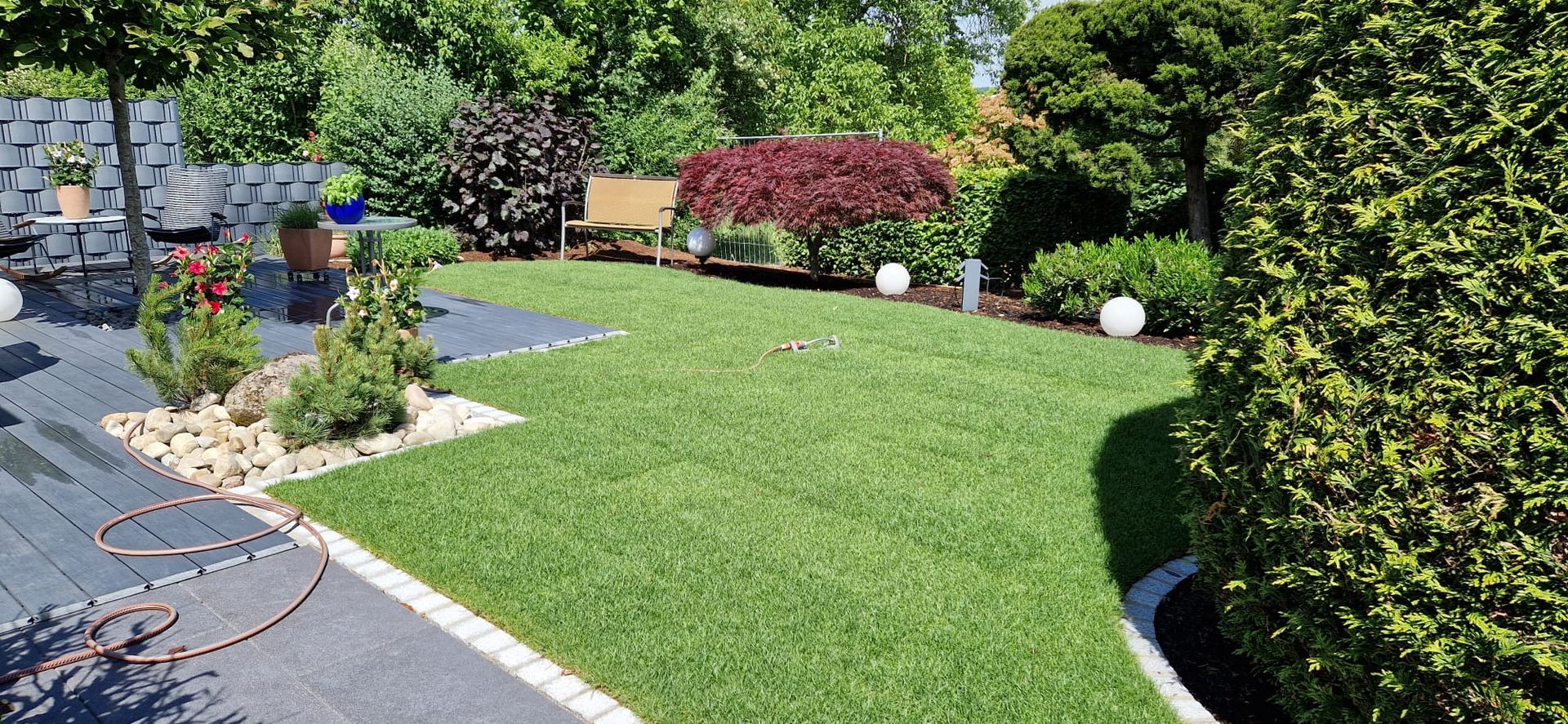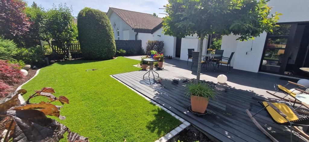 mit einem modernen Übergang zwischen Innen- und Außenbereich. Zudem verlegen wir auch Rollrasen,